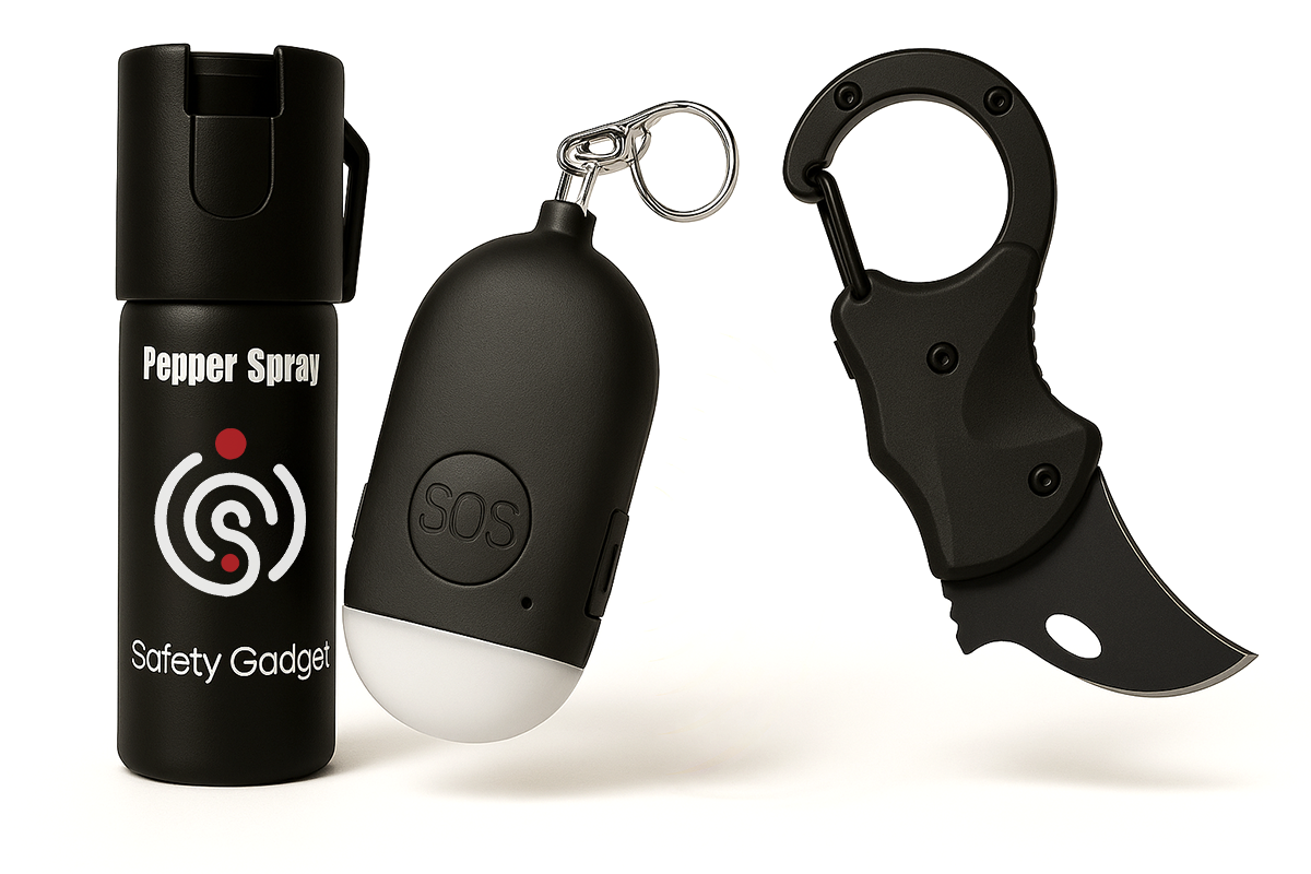 A smart, versatile safety set featuring pepper spray, a loud alarm keychain, and a multipurpose tool—everything you need for quick, dependable protection on the go.