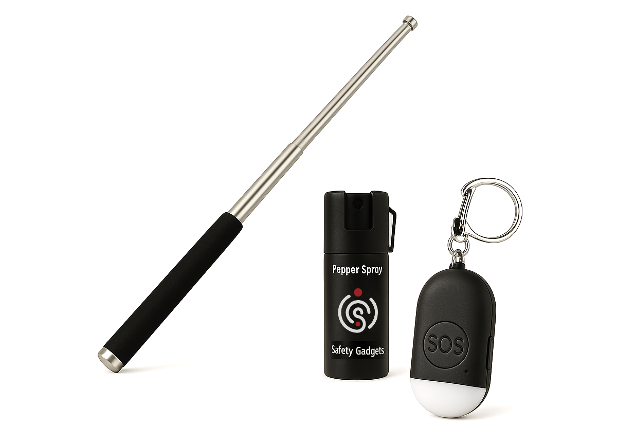 A powerful, travel-friendly combo featuring an expandable baton, strong pepper spray, and a loud alarm keychain—giving you fast, reliable defense in any situation.